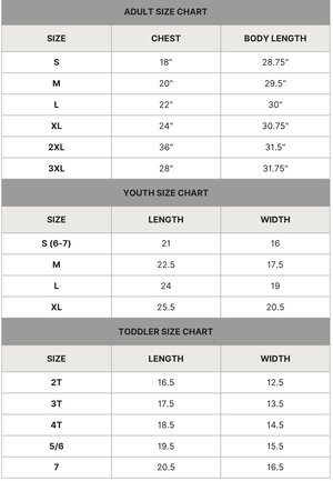 Our T shirt run true to size for adults and toddlers. But, if you want to be extra certain on sizing we recommend reviewing the sizing chart and comparing to your favorite t shirt.
